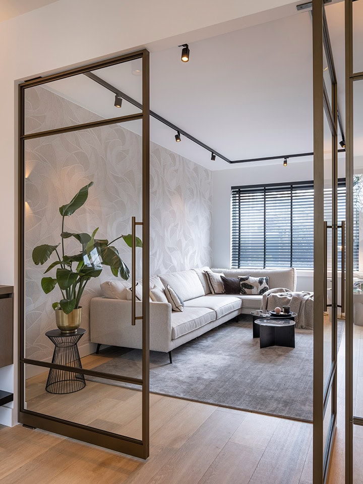Het aluminium profiel is licht en sterk, waardoor de deur moeiteloos opent en sluit. Het ontwerp oogt strak en modern, en past goed bij een interieur met veel glas en licht. Een taatsdeur opent naar beide kanten, wat het gebruik extra comfortabel maakt.