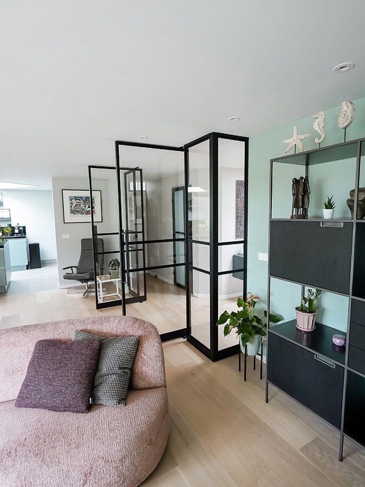 For smaller passages, a single steel pivot door is often sufficient. For wider openings or if you want to make a statement, a double pivot door with or without side panels is a better choice. Both variants are equally functional and are of course made to fit exactly.