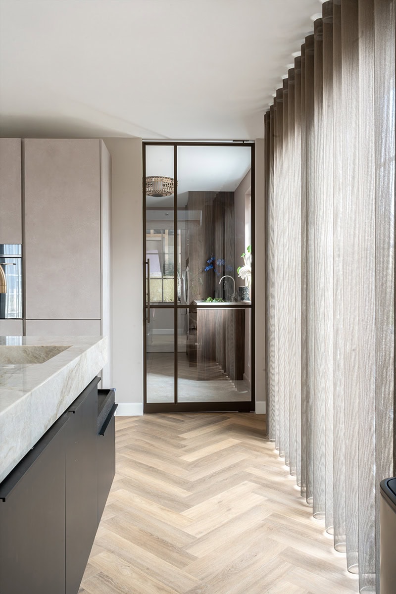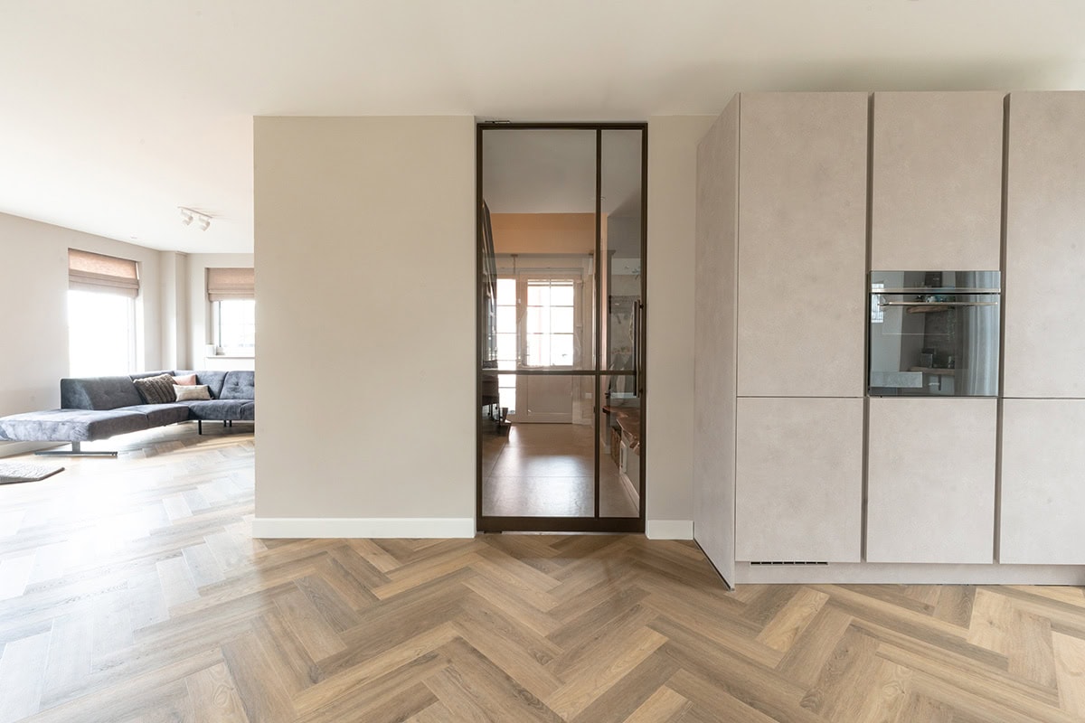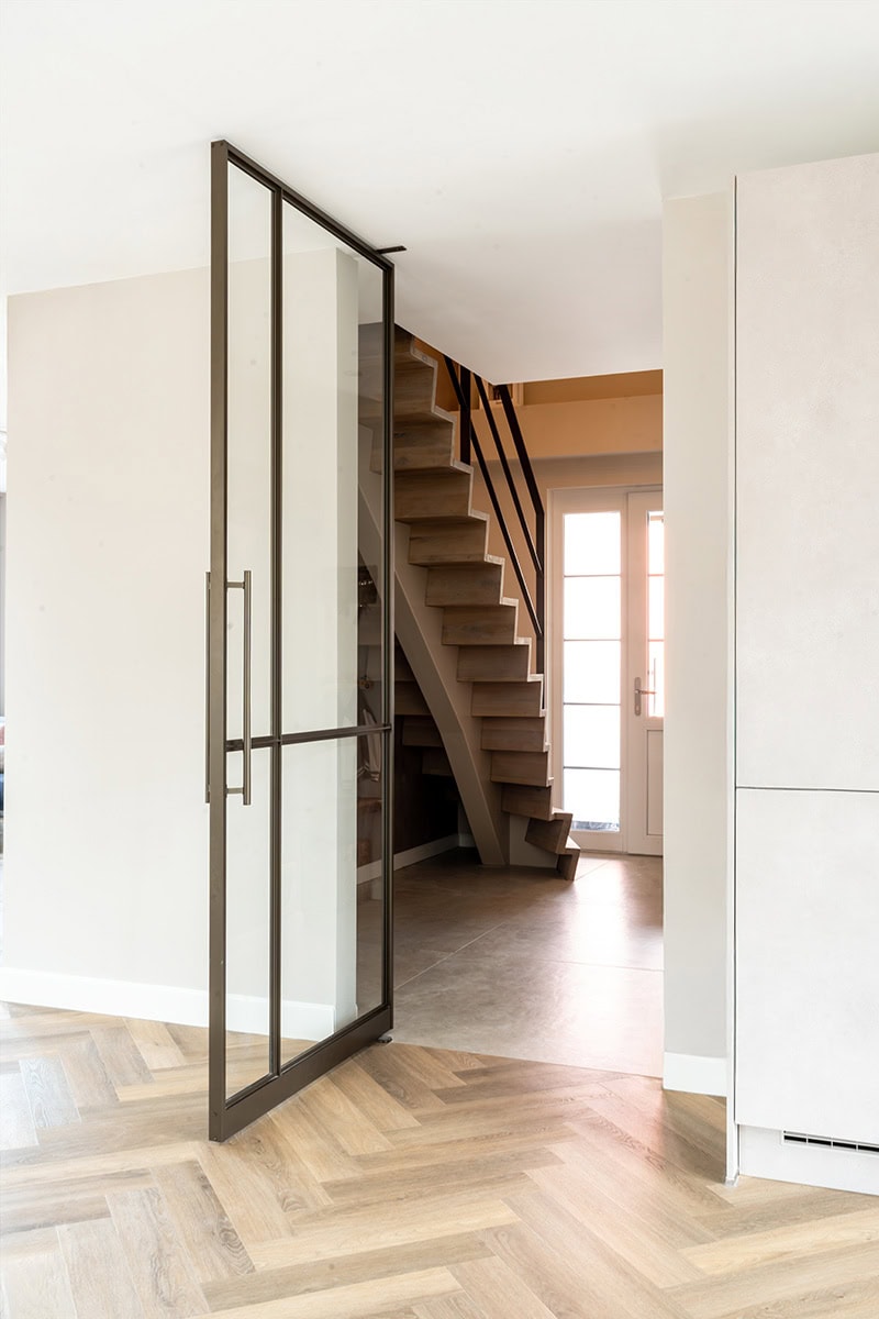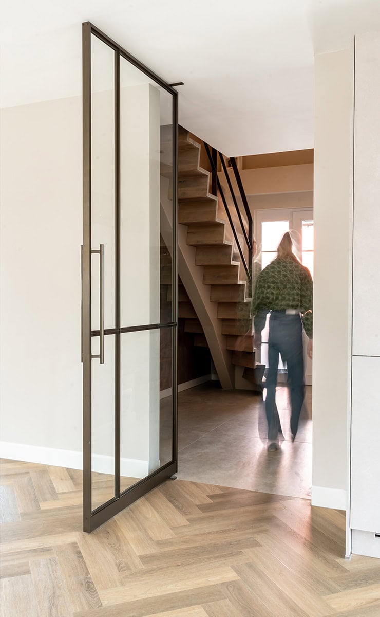 Het mooie aan de taatsdeur is dat je geen kozijn hebt. Hierdoor vallen de strakke wanden goed op als je de deur open hebt staan. De deur verdwijnt als het ware in de ruimte, waardoor het interieur zijn cleane uitstraling behoudt.