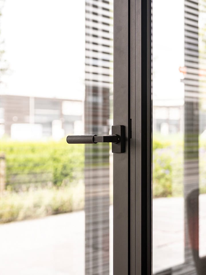 De wanden zijn uitgevoerd met een staande roede op het glas. Dit element zorgt voor een duidelijke lijnverdeling en versterkt de structuur van het geheel, zonder dat het lichtverlies optreedt. De deuren zijn voorzien van een zwarte klink die perfect aansluit op de wandopstelling. Hierdoor ontstaat een mooi geheel waarbij alle onderdelen elkaar ondersteunen in stijl en functie.