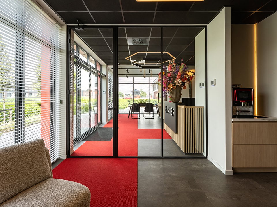 Voor Faber Installatietechniek hebben wij zwarte aluminium kantoorwanden geplaatst, uitgevoerd met een staande roede op het glas voor een strakke en rustige belijning. De deuren zijn voorzien van een zwarte klink die naadloos aansluit bij de volledige wandopstelling en de uitstraling van het kantoor. Het resultaat is een functionele indeling die licht doorlaat en tegelijk een duidelijke scheiding tussen de werkruimtes creëert.