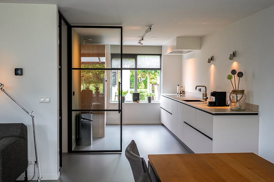 Voor dit project in Goutum plaatsten we een aluminium scharnierdeur met zijpaneel. De deur vormt een stijlvolle afscheiding tussen hal en woonkamer en sluit dankzij de magneetsluiting strak en geruisloos.
