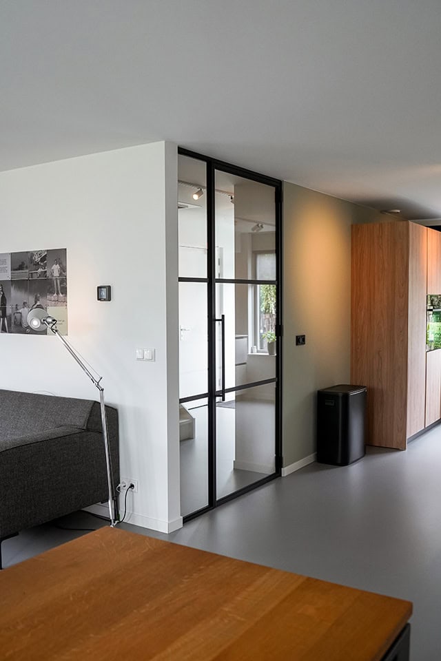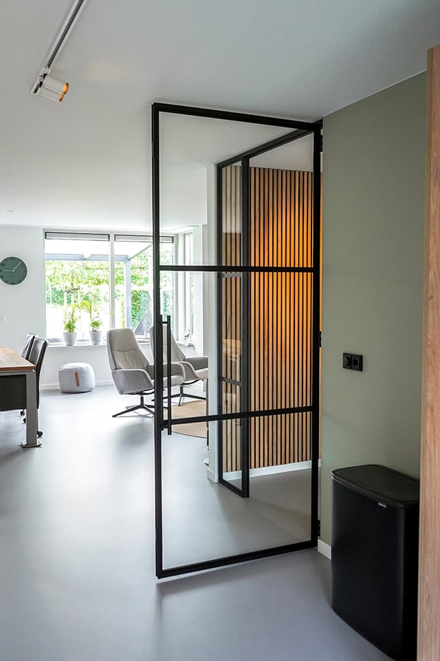 Hoogwaardige stalen scheidingswand met frame en gespiegelde schuifdeur in een modern interieur.