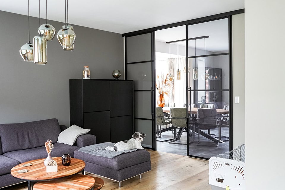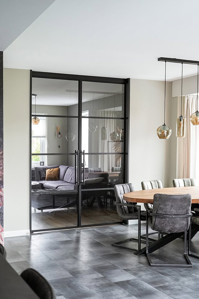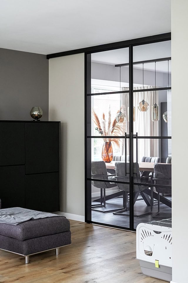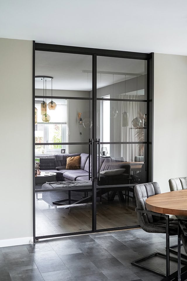 Stalen schuifdeur met zwarte metalen frame en glazen panelen, gescheiden woonkamer en eethoek, moderne industriële interieurstijl.